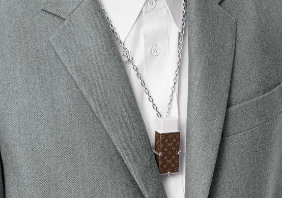 Чехол из кожи украшен классической монограммой модного дома и повторяет прямоугольную форму обычного ластика. Его дополняет цепочка из серебра с талисманом в виде перекрещивающихся букв LV.