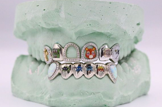 Калифорнийская марка ювелирных украшений для зубов Gabby Elan Jewelry выпцстила грилзы, созданные для поклонника современного искусства Адама Кэндела. Они изготовлены из белого золота и декорированы миниатюрными изображениями, по мотивам известных работ Бэнкси, Такаси Мураками, Кита Харинга и Space Invader. Их дополняют крест Chrome Hearts, опалы и бриллианты. Об этом пишет Hypebeast .