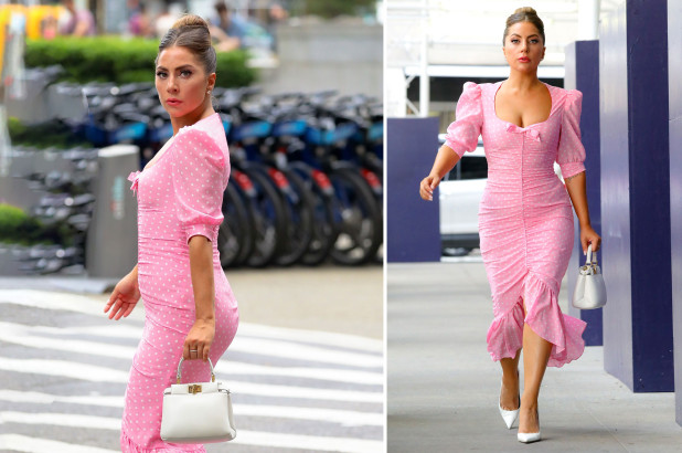 35-летняя певица Леди Гага попала под прицел папарацци во время прогулки в Нью-Йорке. Артистка выглядела потрясающе и элегантно в розовом платье в горошек от Алессандры Рич.