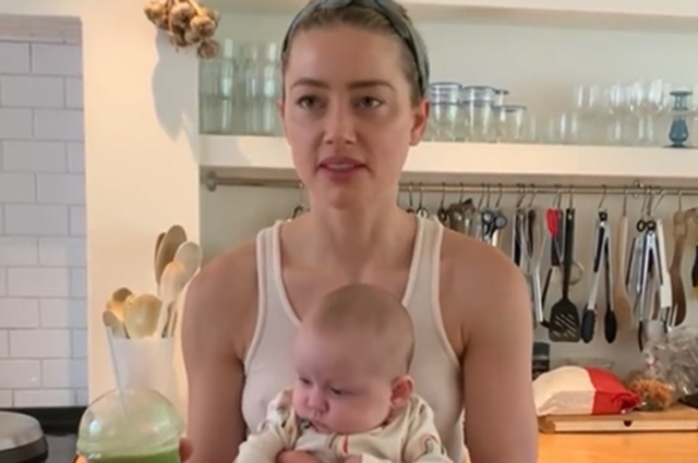 В видео Эмбер пьет напиток, похожий на смузи. В кадре перед Херд на столе лежат различные овощи и фрукты, пытается угадать, из чего приготовлен ее напиток.