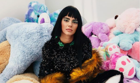 Модель примерила черный парик каре с челкой. Завершающим штрихом стал яркий макияж. Визажисты в течение съемки меняли для Кендалл макияж несколько раз. Знаменитость позировала перед фотографом с синими и зелеными веками и с губами нарисованными черной помадой.