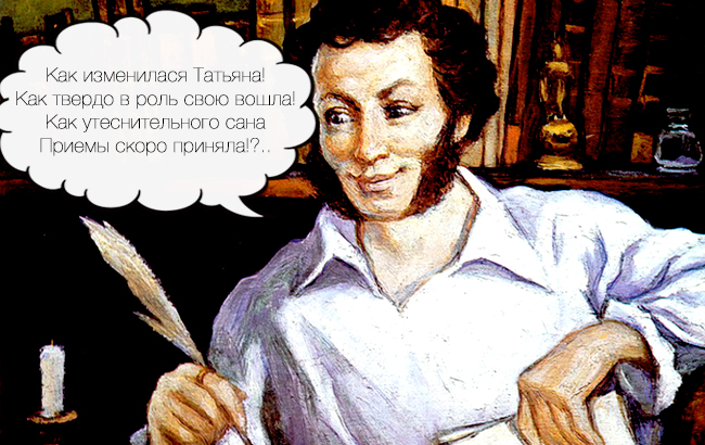 Как ему кажется это звучит: "Как изменилася Татьяна! Как твердо в роль свою вошла! Как утеснительного сана Приемы скоро приняла!?.." («Евгений Онегин», А. С. Пушкин).