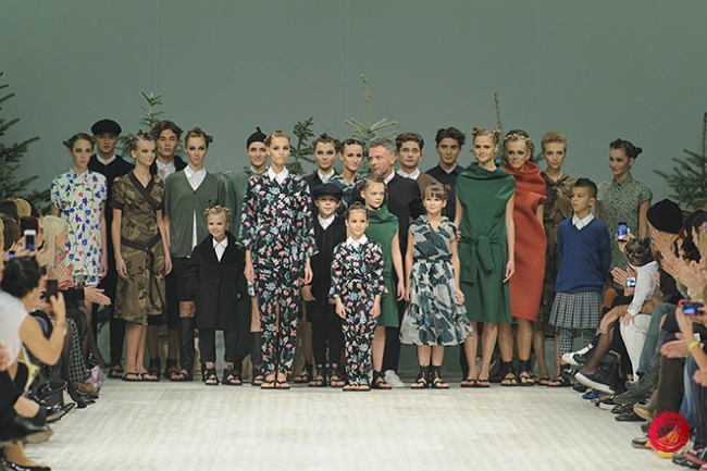 Несмотря на воинственные японские традиции, которые отобразилась в костюмах-кимоно, коллекция получилась очень семейной. Во-первых, потому что одежда была создана для детей и их родителей, а демонстрировалась попарно - на малышах и их «клонированных» взрослых. Во-вторых, комфортный крой, ткани, напоминающие плед, и аппликации в виде елок, по признанию самого автора, появились в показе благодаря теплым дачным посиделкам с его коллегой Викторией Гресь и ее семейством.
