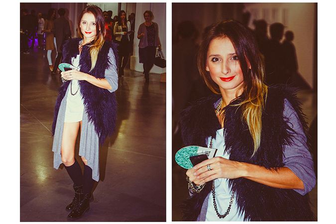Одна из гостей приглянулась нам своим минималистическим, но в то же время актуальным образом, отлично передающем настроение теплой осени. Лаконичное белое платье, серый трикотажный кардиган, вальяжно дополненный черным меховым жилетом. Смелости образу добавляют черные гольфы, а мужские ботинки на низком ходу уравновешивают правильный баланс, который позволяет девушке в подобной одежде выглядеть не вульгарно. Кому-то черно-белый look может показаться слишком скучным, но его обладательница позаботилась и об этом, сделав удачный яркий акцент на губах в виде красной помады. Завершает образ небрежность окрашивание волос «омбре», которое придает девушке ту самую актуальную сейчас естественную небрежность.