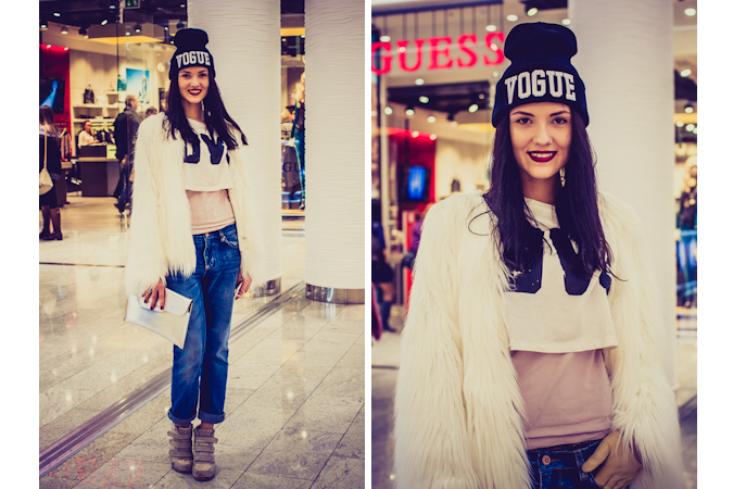 Не так давно мы размышляли на тему того, что украинские представительницы гранжа выглядят, как правило, довольно нелепо. Но как и полагается каждому правилу, в нем есть приятные исключения – как та девушка, покорившая нас своим внешним видом в будний день переполненного магазина. Boyfriend’s jeans, спортивная обувь, смелых ход в виде короткого топа поверх водолазки и невероятно богемного вида белый мех в виде небрежно наброшенной на плечо шубки. Но гран-при этого look’а достойна, конечно же, шапка-бомж с ироничной надписью «Vogue». Подобный аутфит «на каждый день» претендует на лавры Анны Делло Руссо, не меньше.