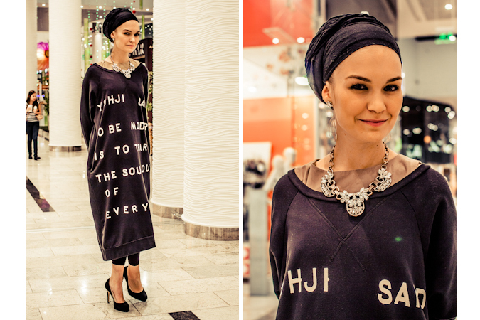 Но самым оригинальным look’ом нас впечатлила директор OLO Fashion Ноа Кременчуцкая. На платье в виде черного свитшота-oversize с ворд-принтом невозможно было не обратить внимание. Девушка удачно дополнила экстравагантную вещь довольно изящными туфлями на каблуке и экзотичным головным убором - тюрбаном, удачно эксплуатируемым любительницами бохо-шика. Завершающим штрихом броского образа стало увесистое колье, которое по традиции последних сезонов уже немыслимо представить без спортивного лонгслива.