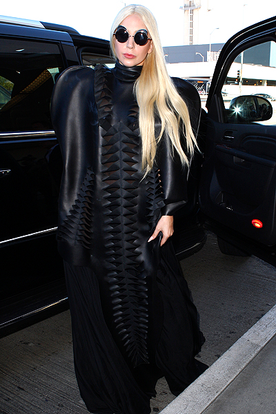 В наряде, состоявшего из прозрачного макси-платья и кожаного топа с объемными круглыми плечами и затейливым вырезом спереди, певицу застали в аэропорту: дива сцены летела в Токио в рамках промо-тура нового альбома ARTPOP.