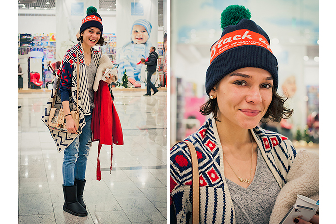 На прошлой неделе мы встретили фэшн-блогера Маргариту Мурадову ( greenteanosugar.com ) на предновогоднем шопинге. Для аутфита выходного дня Маргарита выбрала удобные рваные джинсы и уютную кофту, напоминающую любимый домашний плед – «must-have» этой зимы. В ансамбль к ним блогер добавила кожаные угги и веселую, даже несколько хулиганскую шапку, на которую мы не могли не обратить внимание.