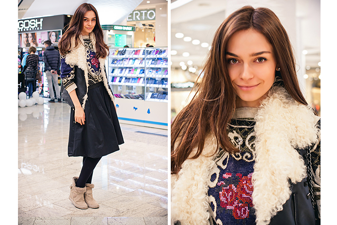 Обладательницы длинных и стройных ног обычно предпочитают подчеркивать свое достоинство либо мини, либо джинсами-скинни. И очень маленькое количество девушек обратит внимание на юбку, как у нашей следующей героини, силуэта «new look» и длиной чуть ниже колен. А зря. Именно такая юбка способна придать женственности и сексуальности больше, чем какой-либо другой предмет гардероба, что доказывают нам популярные ныне фильмы и сериалы об эпохе «60-х». Поэтому ретро-юбка в аккорде со свитшотом в барочные узоры и кожаным жилетом с мехом овчины вполне может быть современной интерпретацией на тему героинь трендовой «Оттепели», ну или «Mad Men» - кому что ближе.