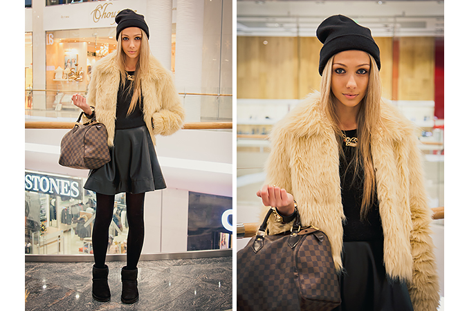 Модный в этом сезоне богемный шик находит свое воплощение в коже и искусственном мехе. Неплохой вариант сочетания этих капризных фактур мы увидели на незнакомке в одном из шоппинг-моллов. В сочетании с дерзкой шапкой и массивной цепью на шее этот look смотрелся весьма органично. Единственная деталь, которую мы бы заменили – это мягки угги. Более выигрышно смотрелись бы тяжелые маскулинные сапоги.