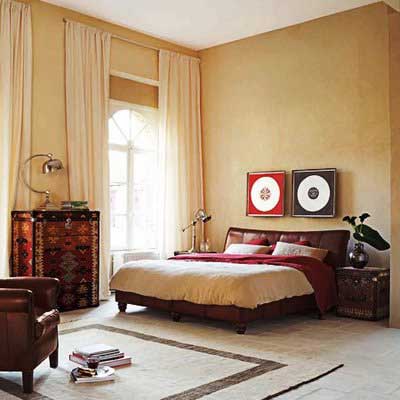 А эта этот интерьер придется по душе представителям мужского пола. Удачный синтез элементов разного стиля создает уютную, способствующую релаксации атмосферу. Сочетание темного и светлого дерева, уместное размещение триптиха в плоскости стены, расположение источника «живого света» справа – что еще нужно для крепкого здорового мужского (а, может, и женского) сна?