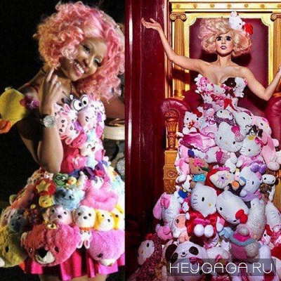 Знаменитая певица Ники Минаж удалось удивить публику нарядом, сшитым из голов плюшевых игрушек. Такой образ она выбрала для съемок в клипе на песню Fireball, которые проходили в 2011 году. Отметим, что это платье невероятно похоже на наряд Lady GAGA 2009 года, ставший сценическим костюмом на песню Hello Kitty. Диковинность ее образа набрала 10 баллов.