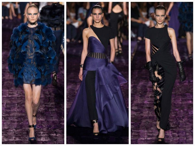 Открывало Неделю моды шоу от Atelier Versace. Донателла Версаче сделала акцент на ассиметричный крой платьев – пышные атласные юбки с разрезом до бедра, брюки с одной штаниной, напоминающие вечерние платья с все там же высоким разрезом, лифы-корсеты, переходящие во вставки из полупрозрачных тканей, обилие бахромы, геометрические аксессуары и фурнитура из глянцевого металла. Но главную роскошь нарядам придает цвет – черно-белая палитра удачно обыграна яркими оттенками ультрафиолетового.