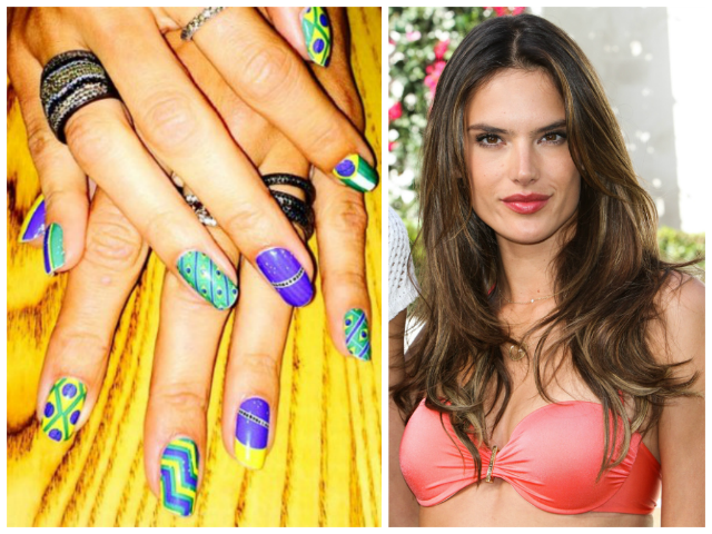 «Ангел» Victoria’s secret Алессандра Амбросио сделала пестрый маникюр, приуроченный специально к Чемпионату мира по футболу. Бразильская модель является заядлым футбольным болельщиком, поэтому она не могла пропустить вчерашний матч родной команды Германия-Бразилия, который закончился неутешительным для команды счетом - 7:1.