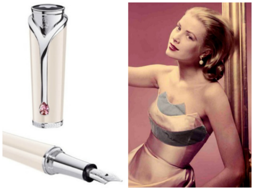 Первая ручка в честь Келли была выпущена еще в 2011 году. Сегодня же бренд представляет серию с утонченным и женственным дизайном в цвете «айвори». Корпус ручки выполнен из драгоценной смолы цвета слоновой кости с отделкой из платины. Клипсу на колпачке украшает восхитительный розовый топаз в форме лепестка розы сорта GracedeMonaco, выведенной в 1956 году по случаю свадьбы Грейс Келли и князя Ренье. Да и сама клипса образует форму женского декольте. Также на ручке выгравирован узор, который был вдохновлен гербом княжества Монако.