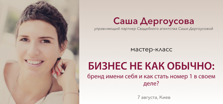 7 августа в рамках проекта Smart Factor Саша Дергоусова - преуспевающий владелец и идейный вдохновитель Свадебного агентства Саши Дергоусовой, проведет мастер-класс «Бизнес не как обычно: бренд имени себя и как стать "№ 1" в своем деле?» в рамках которого расскажет о том, как расширить границы бизнеса и сделать его движущей силой; как совместить духовный, осознанный подход к каждому клиенту и успешно развивать бизнес; как проживать жизнь тотально, так как она есть.