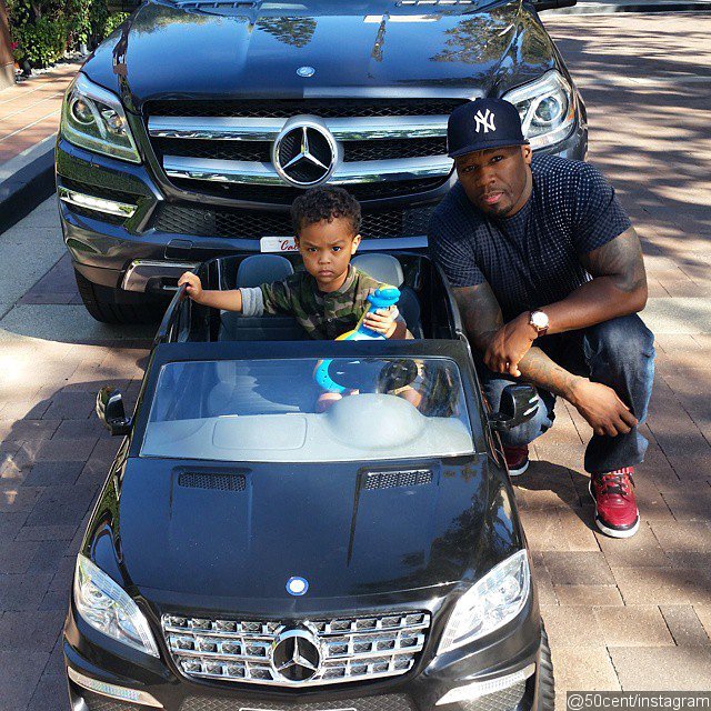 39-летний рэпер купил сыну миниатюру своего внедорожника Mercedes ML450 на второй день рождения. В своем Instagram счастливый отец выставил фото с сыном, где тот сидит за рулем своего игрушечного, но моторизованного авто, на фоне такого же настоящего папиного. Малыш в черном миниатюрном мерседесе выглядит как миниатюрная копия самого 50 Cent. Видимо маленький Сайр весь в отца.