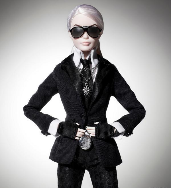 Модная кукла по имени Карла выглядит нарочито стильно и в точности копирует образ легендарного креативного директора модного дома Chanel: брюки-скинни, приталенный черный жакет, рубашка и галстук, перчатки и даже темные очки.