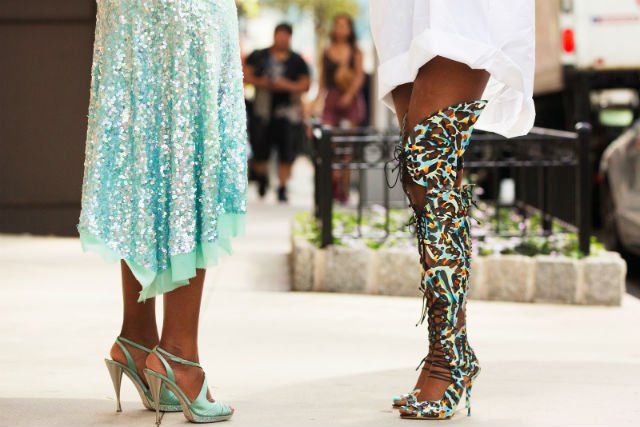 Изящные бирюзовые босоножки на серебристом каблуке "в дуэте" с умопомрачительными и смелыми ботфортами с разноцветными бабочками от Sophia Webster явно не случайно оказались в гардеробе своих обладательниц, которые точно знают толк в уличной моде.