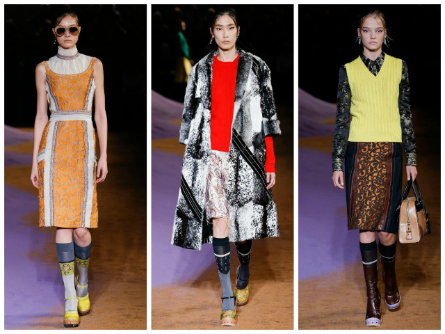 Новая коллекция Миуччи Прады в этом сезоне представила "изнанку моды" - почти все вещи коллекции были прошиты широкими белыми швами, подол небрежно обрезан ножницами, а из рукавов торчали нитки, создавая впечатление недоработанных изделий и одежды, надетой навыворот. Модели, шагающие по подиуму вдоль лиловых песчаных дюн, продемонстрировали образы, где богатство и бедность граничат по соседству.