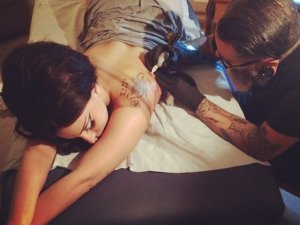 Задумку звезды воплотил известный тату–мастер Эрик Гонсалес, который сначала разработал эскиз, а затем перенёс рисунок на кожу экставагантной певицы.