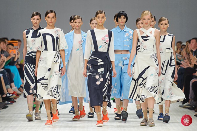Эстетику социального реализма (частой тематикой которого была "Революция - перестройка"), соединенного с поп-артом, мы увидели в принтах того же каштанового листа и текстовой графике "Poustovit". Но что-то подсказывает, что не только внешний признак соц-арта, но его мощный смысловой месседж так же скрыт где-то в складках летящих юбок коллекции весна-лето 2015.