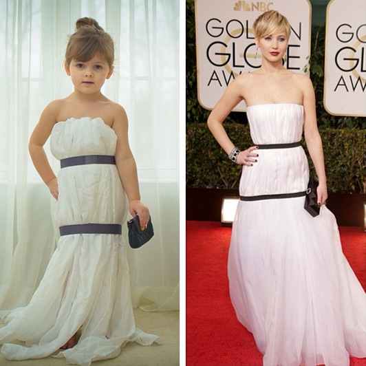 4-летняя Мэйхем, жительница Огайо, обзавелась огромным количеством поклонников благодаря тому, что позировала в мини-копиях дизайнерских нарядов, сделанных собственноручно, в которых знаменитости блистали на красных дорожках. Так, снимки, сделанные мамой малышки Энджи, повторяли, например, роскошные образы Дженнифер Лоуренс в платье Dior и Люпиты Нионго в Ralph Lauren.