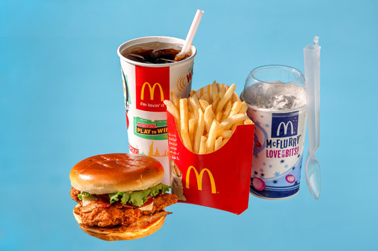 Макчикен – 750 ккал, картошка фри – 340 ккал, Кола – 200 ккал, МакФлури – 690 ккал