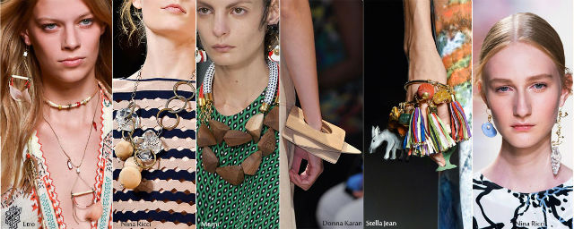 Возврат к 70-м - эпохе хиппи привносит в бижутерию яркие краски, длинные колье с летящими подвесками (причем от вполне стандартных размеров до гиперболизированных), дерево, кисти (например, из замши или ее имитации), перья, перламутр и самоцветы. Серьги становятся непременным атрибутом образа: это могут быть просто крупные серьги летящих силуэтов, но особенной изюминкой вашего образа может стать "single-earring look", который достигается асимметричностью путем использования сережек разной формы, длины или цвета.