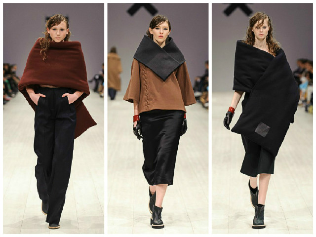Широкие брюки, платья-футляры, пальто-коконы, вязанные хомуты, перфорация на коже, напоминающая ножевые порезы и фактурные косы на дутой пальтовой ткани, а также безусловные хиты коллекции - объемные шарфы-накидки, словно защищающие свою обладательницу от внешних воздействий, в то же время, добавляют ее фигуре некой монументальной силы.