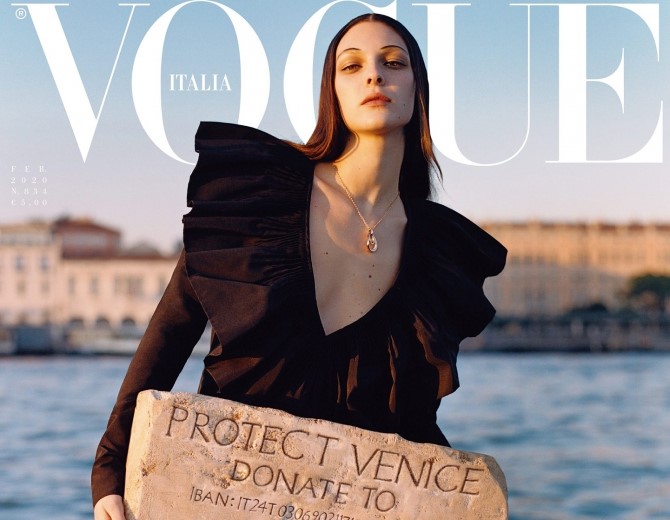 Італійський Vogue у лютневому номері закликає врятувати Венецію. В останні роки місто особливо страждає від повеней, а в листопаді рівень води піднявся на рекордні 187 сантиметрів. Міська влада витрачає мільярди євро, щоб вирішити проблему, убезпечити жителів і туристів та відновити Венецію після повеней.